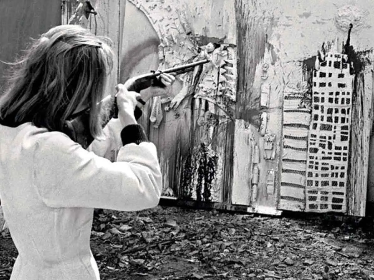 圣法勒后来成为“新现实主义”的唯一女性成员,这是一个先锋派艺术运动,旨在创造“感知现实的新方式”,这是尼基迫切需要的。在三十多岁时,圣法勒开始了一系列名为《射击》的艺术表演,她通过向嵌入石膏中的装满颜料的物体开枪来创作绘画。当这些物体被击中时,颜色会爆炸到画布的白色表面。尼基的孙女、尼基·德·圣法勒慈善艺术基金会的主管布鲁姆·卡德纳斯解释说,《射击》是发泄她对世界不公的愤怒的一种方式。圣法勒在一次电视采访中说:“只有女人才能利用男人为破坏性目的而设计的那些工具来达到建设性的目的。”