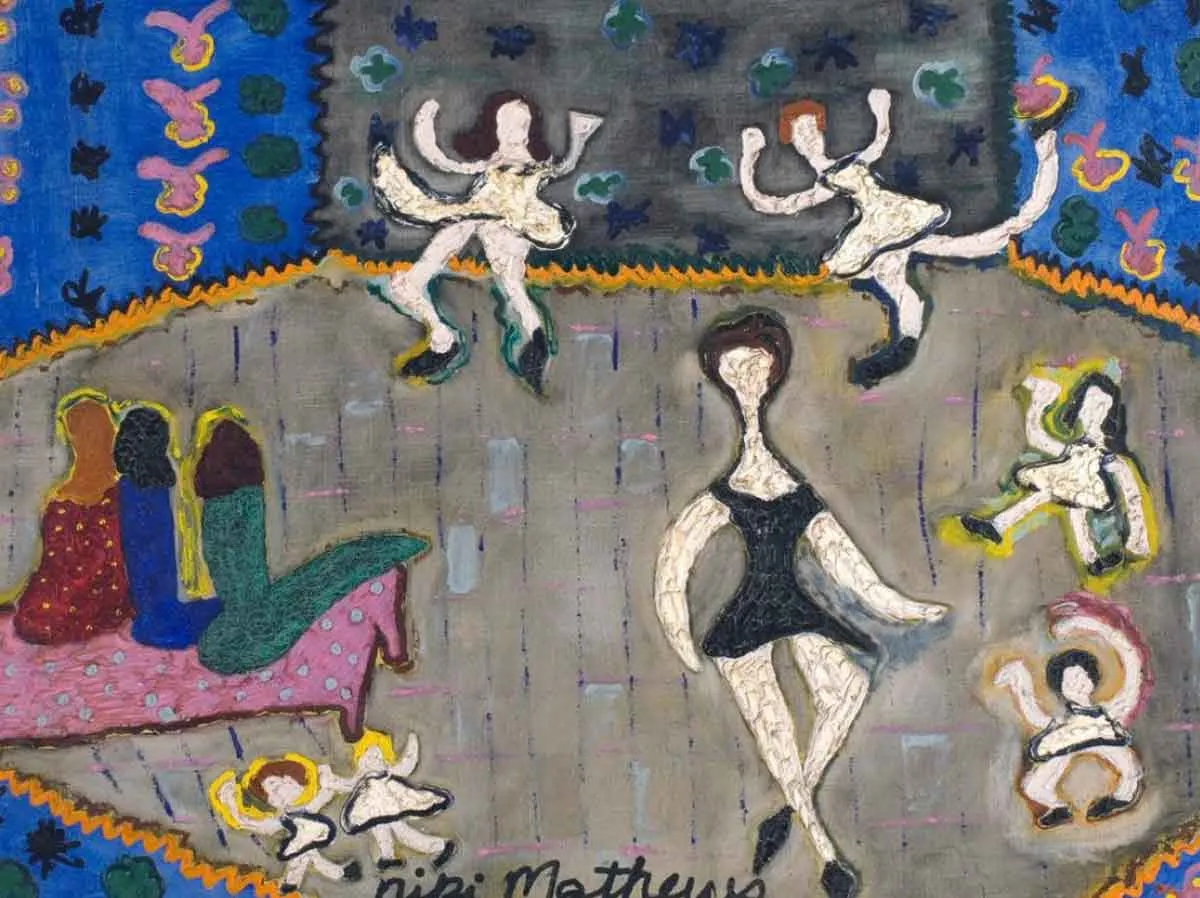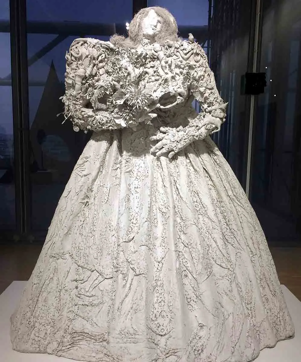 圣法勒今天最出名的是她的“娜娜”(或法语中的《鸡》)——快乐的、不可阻挡的、具有生命力的生育女神。但她们的起源并非如此。1963 年——她和哈里最终离婚的那一年——圣法勒开始创作一系列大型的、带有痛苦表情的新娘雕塑。这些幽灵般的女性形象显得不堪重负,她们穿着巨大的婚纱,婚纱上装饰着家庭生活和母性的残骸——玩偶零件、玩具士兵、玩具飞机、婴儿鞋和化石花朵。这些作品抗议了女性在社会中承担的刻板角色——这些角色是由父权制社会确立的,旨在将女性“留在她们的位置”。但很快,这些令人不安的形象从痛苦的、无色的女性压迫的象征,演变成巨大的、多色女性自由的断言。“娜娜”诞生了!