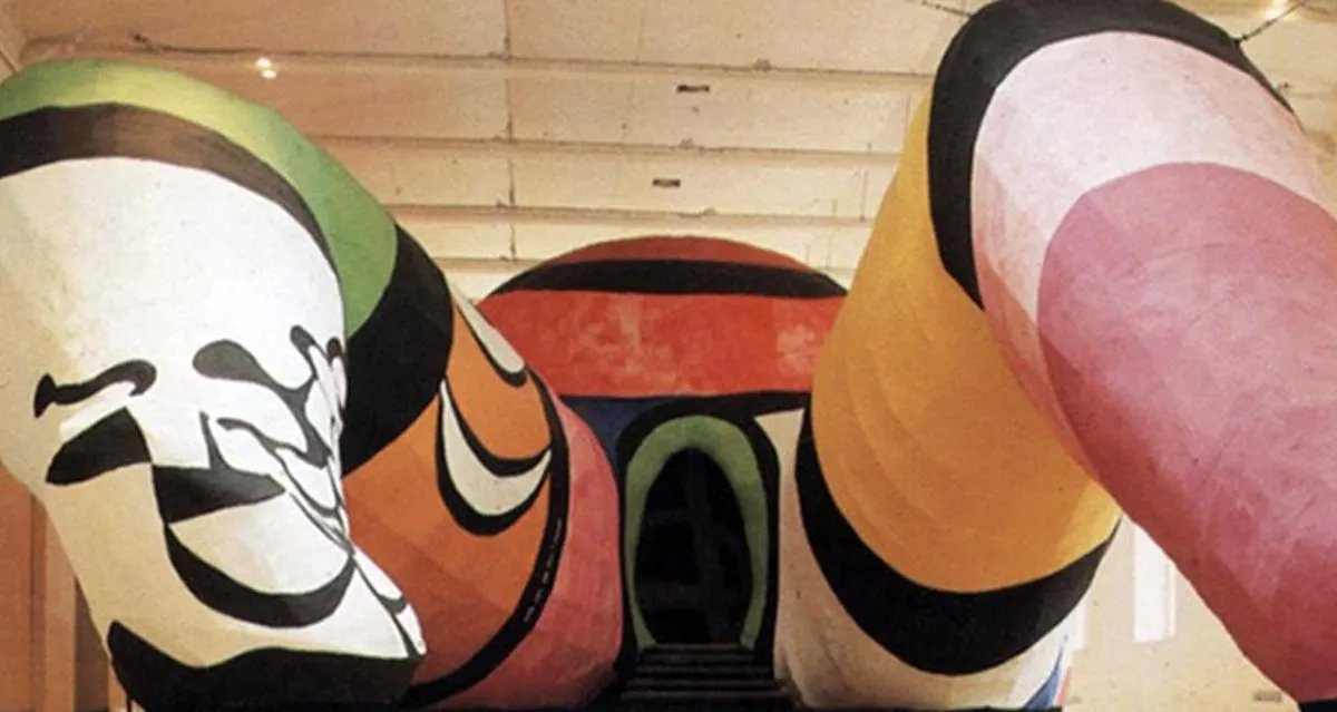 圣法勒的第一件大型“娜娜”——《洪》(瑞典语中的“她”)——是为 1966 年斯德哥尔摩的展览而创作的。 这是一个 90 英尺长的斜躺的“娜娜”,尼基称之为“大教堂”。人们被邀请通过她的阴道走进这个雕塑内部。