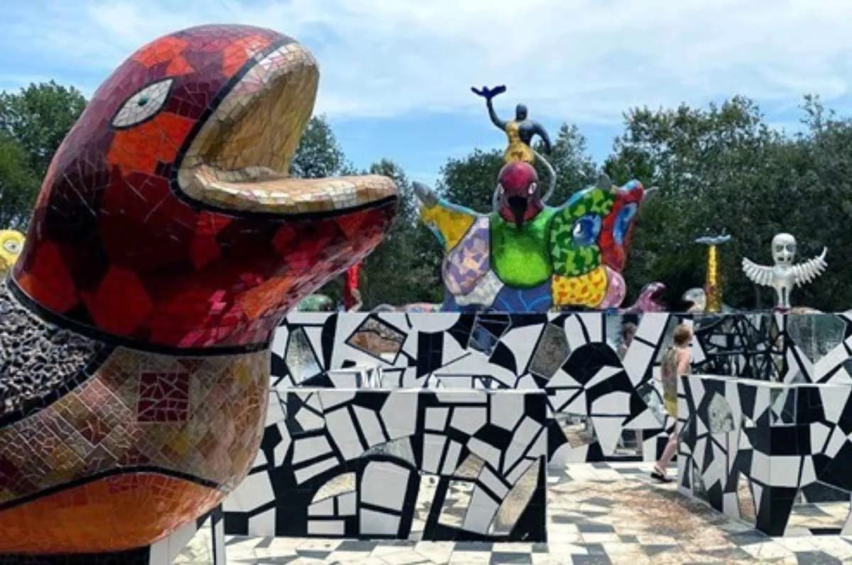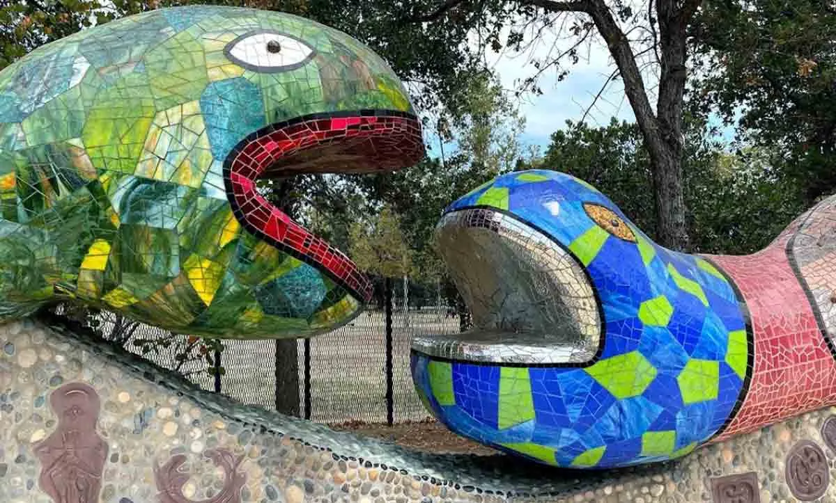 花园的每个表面都覆盖着马赛克,马赛克由各种各样的材料制成,包括玻璃、陶瓷瓦和抛光石。不幸的是,这位艺术家没有活到看到这座花园完工,卡利菲亚女王在她神话般的加州王国上空胜利而壮丽地升起。尼基·德·圣法勒于 2002 年因吸入雕塑中散发出的有毒聚酯粉尘而导致的肺病去世——这是一个奇怪的命运。拯救她生命的艺术最终夺走了她的生命。卡利菲亚女王的神奇圈是圣法勒在美国创建的唯一一座雕塑花园,也是她实现的最后一个重大项目。