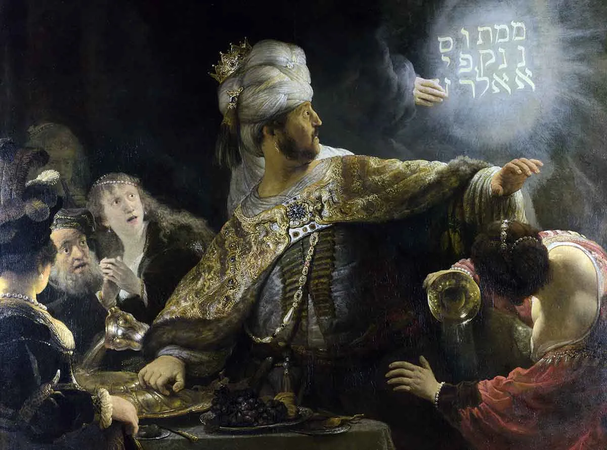 伦勃朗再次从圣经来源中汲取他的主题,这一次是从旧约中。迦勒底王伯沙撒正在他的宫廷里举行宴会,这时一只手出现在墙上写字。国王因此惊慌失措,“他的腿的关节松开了,他的膝盖互相碰撞”。最终,但以理解开了铭文的意义,他将其解读为“默尼,默尼,提客勒,乌法尔辛”。但以理接着解释说,这是上帝对这个亵渎神灵和拜偶像的国王的愤怒:“上帝已经数算你的国,并且已经完结了……你在天平上被称过,已经轻了……你的国被分开了,赐给米底亚人和波斯人。”故事继续讲述伯沙撒在当夜暴亡,以及米底亚王大利乌继位。