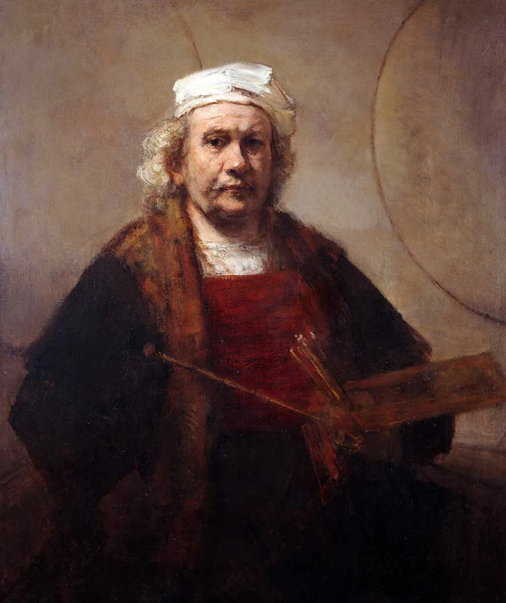 随着伦勃朗年事渐长,他放弃了早期对人物和物体进行精确和细致描绘的风格——例如,《两位老者争论》(1628年)——这种“内在情感”越来越通过他绘画的光线来传达。例如,到他创作1659年的《自画像》时,光线的色调效果与厚重颜料的物质性不相上下。脸上的色调和色相非常局部和多样——其程度之高,以至于它们与光线的照射方式有着多方面的联系。光线至少与所使用的颜料一样有效地传达了三维效果。手和右臂大概是从形式上来说未完成的,但在其微妙的光影层次方面,它们清晰可见,直到指节和血管的细节。事实上,缺乏正式的完成并不意味着缺乏色调上的完成。在他对手的描绘中,光影体现出来并接管了形式的任务,完成了可信的视觉表现。