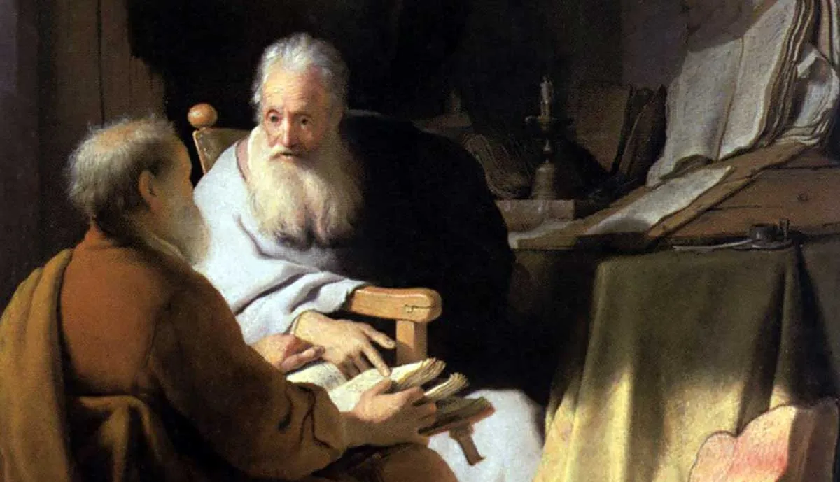 关于伦勃朗这幅画的标题,普遍认为是《沉思的哲学家》,其沉思的氛围也支持这一点。然而,1738年这幅画的目录条目称其为《托比特和安娜等待托比亚斯》,这是对次经《托比特书》中一个故事的演绎。这个故事讲述了亚述尼尼微的盲人托比特,他派他的儿子托比亚斯前往埃克塔巴纳取回一笔债务。在埃克塔巴纳期间,托比亚斯战胜了诅咒,娶了莎拉,并返回尼尼微,托比特因他的耐心和虔诚而治愈了他的失明。这似乎更符合我们在绘画中看到的内容,特别是可以解释女性人物的存在及其在右前景炉火中的突出位置——托比亚斯的母亲安娜。