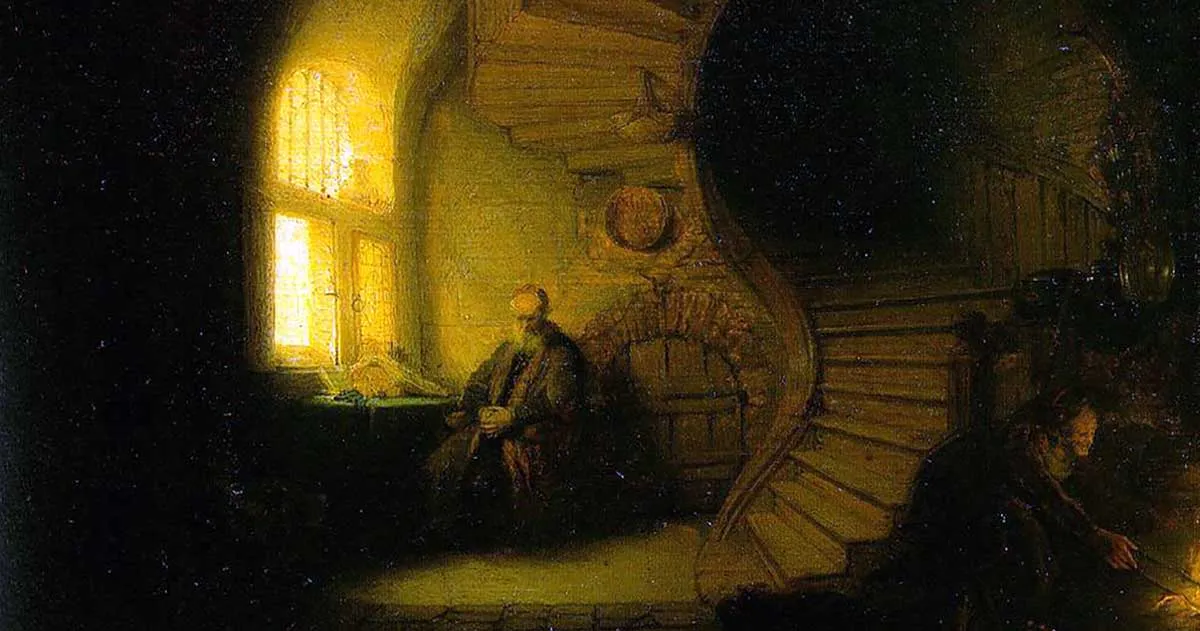 托比特的失明导致了他的脸被阴影笼罩而低垂。正如他的紧握的手所表明的那样,他从祈祷中脱离了世界,而不是形而上学的思考。螺旋楼梯在构图中很突出。它的底部和上部都光线充足,中间通道则处于黑暗之中。这可以标志着灵魂从低级物质世界通过虔诚、祈祷和在逆境中对救赎的纯粹信念的朝圣之旅。也许它也与叙事有关——托比亚斯从危险中返回的愿望得到了预示。