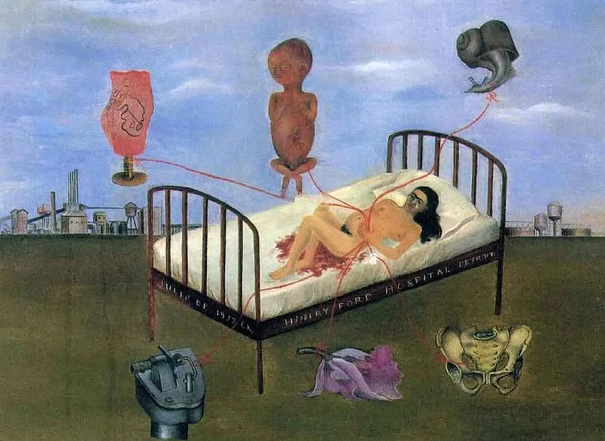 1932年7月,弗里达流产,导致严重出血,需要住院两周。在她超现实主义的自画像《亨利·福特医院》(1932年)中,弗里达表达了她流产时感到深深无助。她画出了自己赤裸、流血的身体躺在医院的床上,并被六个象征性物体束缚着:一只蜗牛、一个男性胎儿、一株薰衣草卡特利亚兰花、一件被认为是高压灭菌器的医疗设备、女性生殖解剖学教学模型和一块人类骨盆骨。弗里达失去孩子的巨大痛苦,几个月后又因母亲在墨西哥因手术并发症去世而加剧。
