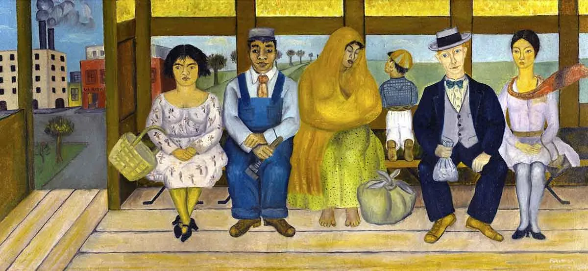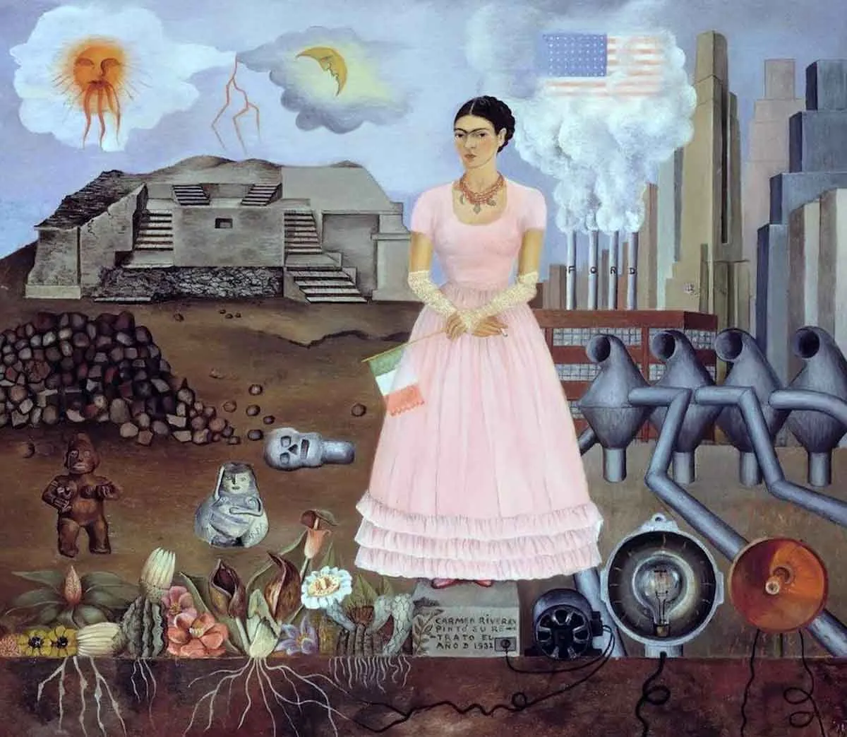 20世纪30年代初,这对夫妇前往美国,他们的关系在悲伤时刻中经受了多次考验。里维拉在美国取得了成功,获得了底特律艺术学院和纽约市洛克菲勒中心等多项重要的壁画委托。另一方面,弗里达却越来越厌倦了与上流社会客人的浅薄社交,以及工业化和人口过剩的美国。在她题为《墨西哥和美国边境线上的自画像》(1932年)的画作中,她表达了她对墨西哥农业文化和简单生活的强烈渴望,摆脱资本主义和现代工业的束缚。