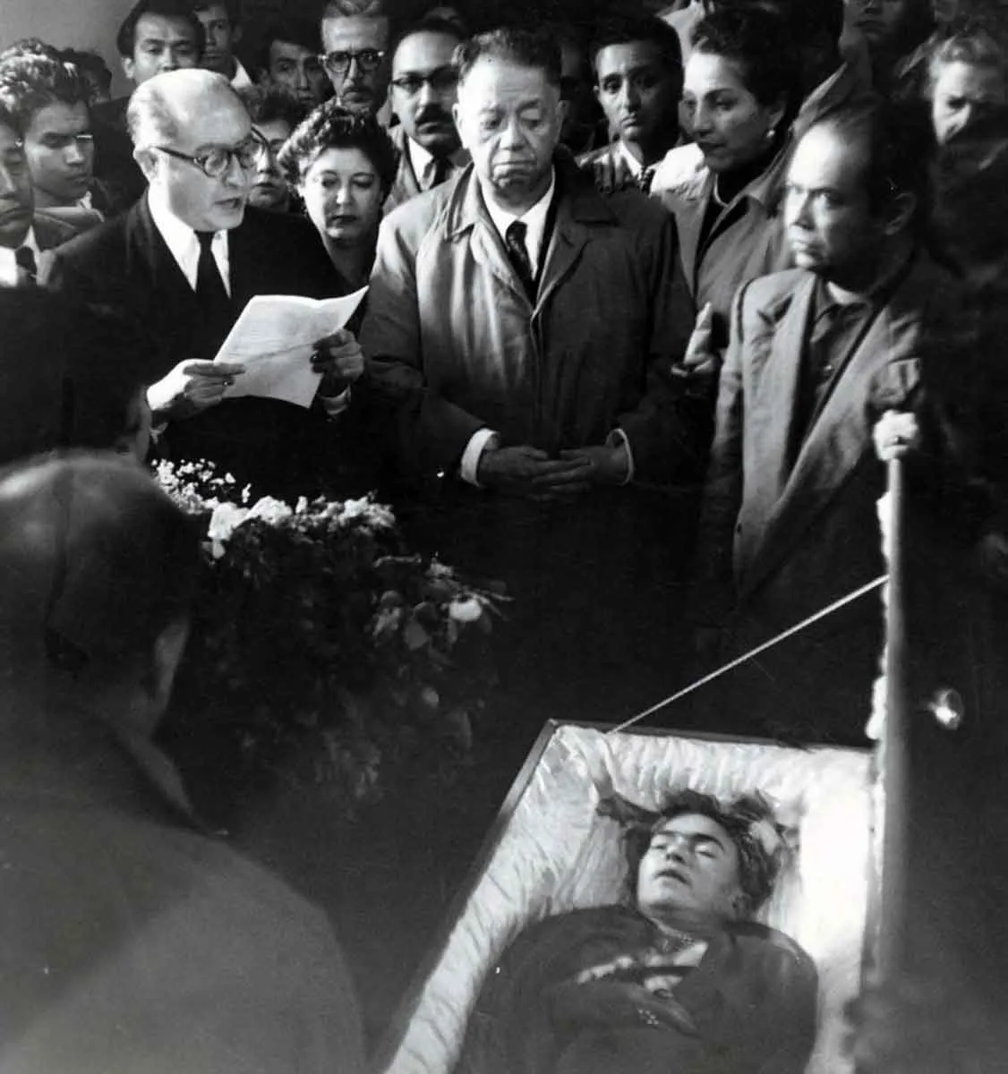 在生命的最后几年,尽管健康状况不佳,弗里达仍然积极参与政治活动,重新加入墨西哥共产党,并帮助收集支持世界和平理事会的签名。1954年7月去世前不久,弗里达甚至参加了一次抗议美国中央情报局入侵危地马拉的示威活动,这最终加剧了她的支气管肺炎。她的护士发现她死在床上,在她最后一次公开露面不到两周后。里维拉负责葬礼安排,确保弗里达得到体面的国葬。数百名哀悼者以及墨西哥著名的文化和政治人士纷纷前来向弗里达表达最后敬意。她身穿传统的特瓦纳服装下葬,棺材上覆盖着一面带有锤子和镰刀等典型共产主义符号的旗帜。