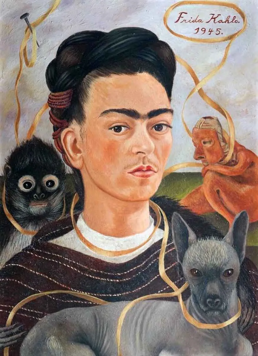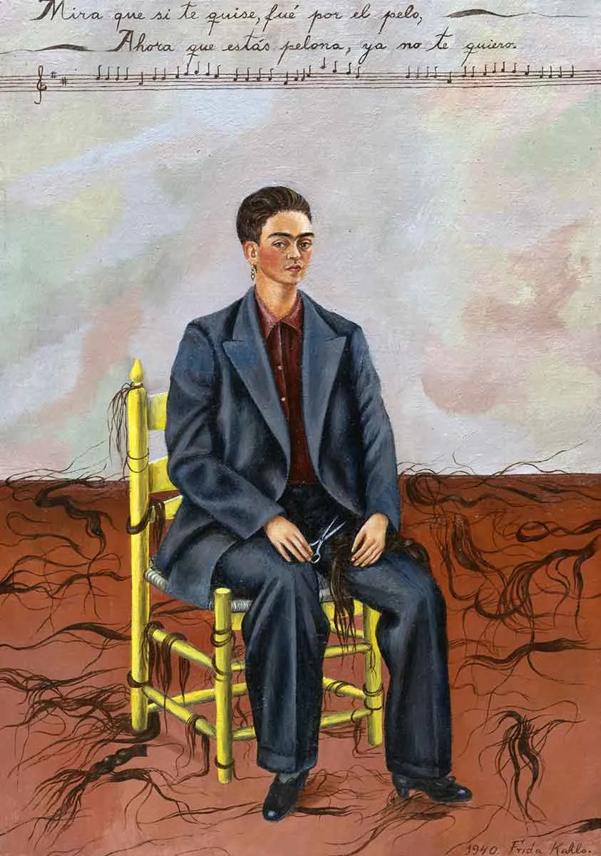 1939年11月,与里维拉离婚后,弗里达搬回了蓝屋,专注于自己的事业和生计。在那里,她开始了富有成果的一段时期,成功完成了多幅杰作,包括《两个弗里达》(1939年)和《剪短头发的自画像》(1940年)。在后者中,她描绘了自己剪短头发,穿着男性服装的形象,展示了她独立的姿态,并庆祝离婚后的生活。弗里达的艺术成就也越来越受到赞誉,她的作品在墨西哥城、纽约和旧金山的三次国际展览中展出。1940年8月,弗里达的健康状况因酗酒而恶化,她收到了托洛茨基遇刺的噩耗,这让她悲痛欲绝。