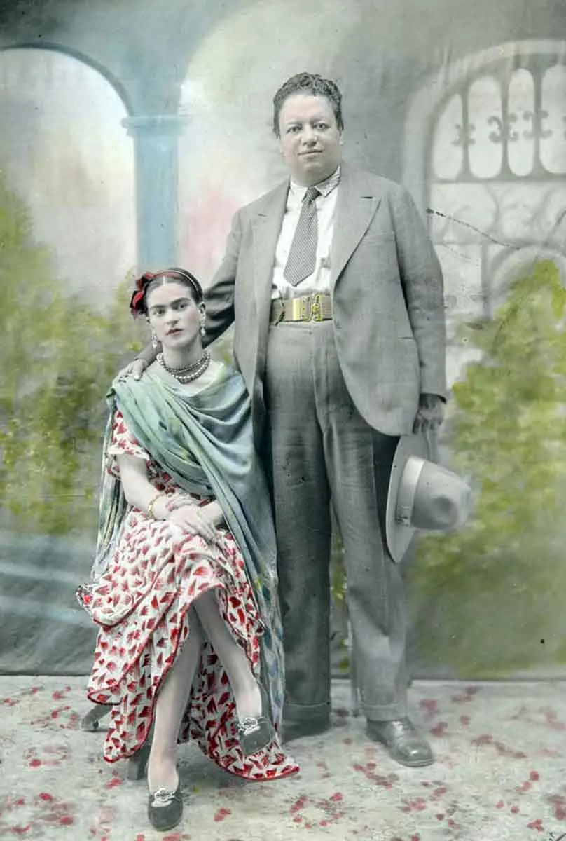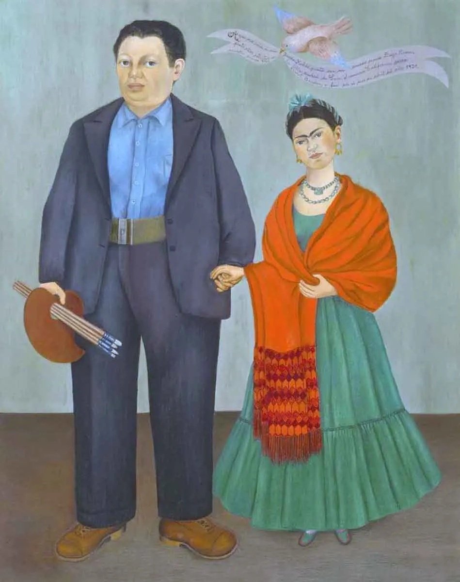 弗里达·卡洛自己这句著名引言总结了她与迭戈·里维拉长达数十年的动荡关系。迭戈·里维拉是一位同样来自墨西哥的艺术家,两人于1929年结婚。这是弗里达的第一次婚姻,而对迭戈来说是第三次。他们的结合充满了激情、争吵和不忠,并受到媒体的广泛关注。这对夫妇同样热衷于墨西哥革命后的国家命运,他们对马克思主义和“墨西哥性”(Mexicanidad)的共同信仰,以及对艺术的热爱,将他们紧紧联系在一起。