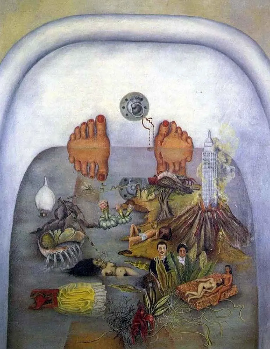 在此期间,弗里达还遭受了一系列健康问题,使她身心俱疲。她接受了阑尾切除术、两次堕胎手术、坏疽趾的截肢手术以及多次足部手术。在象征意义丰富的画作《水给了我什么》(1938年)中,弗里达躺在浴缸里亲密的视角展现了她内心深处的挣扎和回忆。死亡和毁灭占据了显著地位:我们看到一座摩天大楼从一座喷发的火山中冒出来,一个骷髅躺在傻瓜的脚边,子弹穿透了贝壳,一只无生命的啄木鸟停在一棵树上。画作的中心是一个赤裸的女性形象漂浮在水面上。附近有一对夫妇,据信是弗里达的父母,以及躺在床上的两个不同肤色的女性情人(她们后来出现在她的画作《森林中的两个裸体》中)。