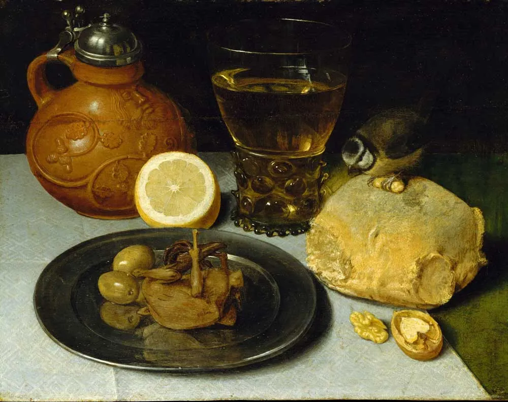在这幅画中,我们可以看到一张摆放着面包、柠檬、满满一杯液体、一个酒壶和一个银盘的桌子,银盘上放着两颗黄绿色的橄榄和一只煮熟的鸟的残骸。附近,一只活鸟栖息在面包上,爪子里抓着一颗核桃,这颗核桃可能来自它旁边的一个核桃壳。这只活鸟的目光牢牢地盯着另一只鸟,这只鸟的腿或翅膀从它的头部伸出来,放在一个盘子里,已经被煮熟了。这种生与死的鲜明对比,17世纪的观众一定不会忽视。