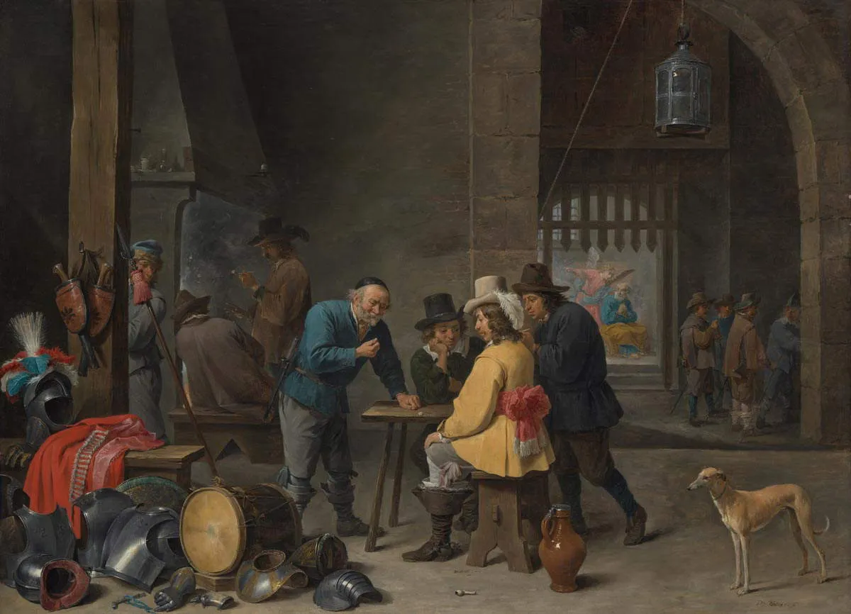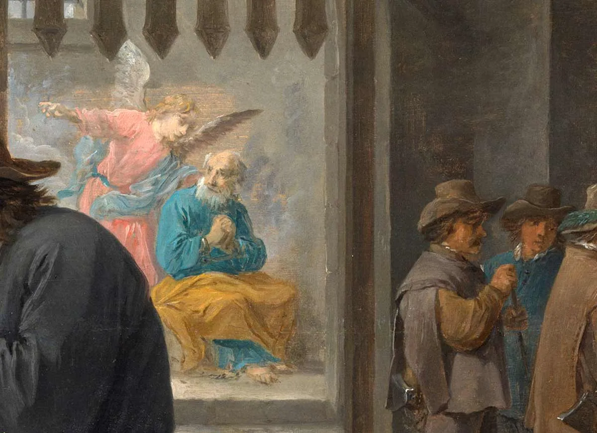 在大卫·特尼尔斯(小)的《警卫室与圣彼得的获救》中,艺术家展现了圣彼得获救的时刻。然而,这次获救发生在一个凌乱的警卫室里,而不是神圣的场所。通过将这个关键的神圣事件放在一个简陋的世俗室内,特尼尔斯宣扬了神圣存在于日常生活中的理念。