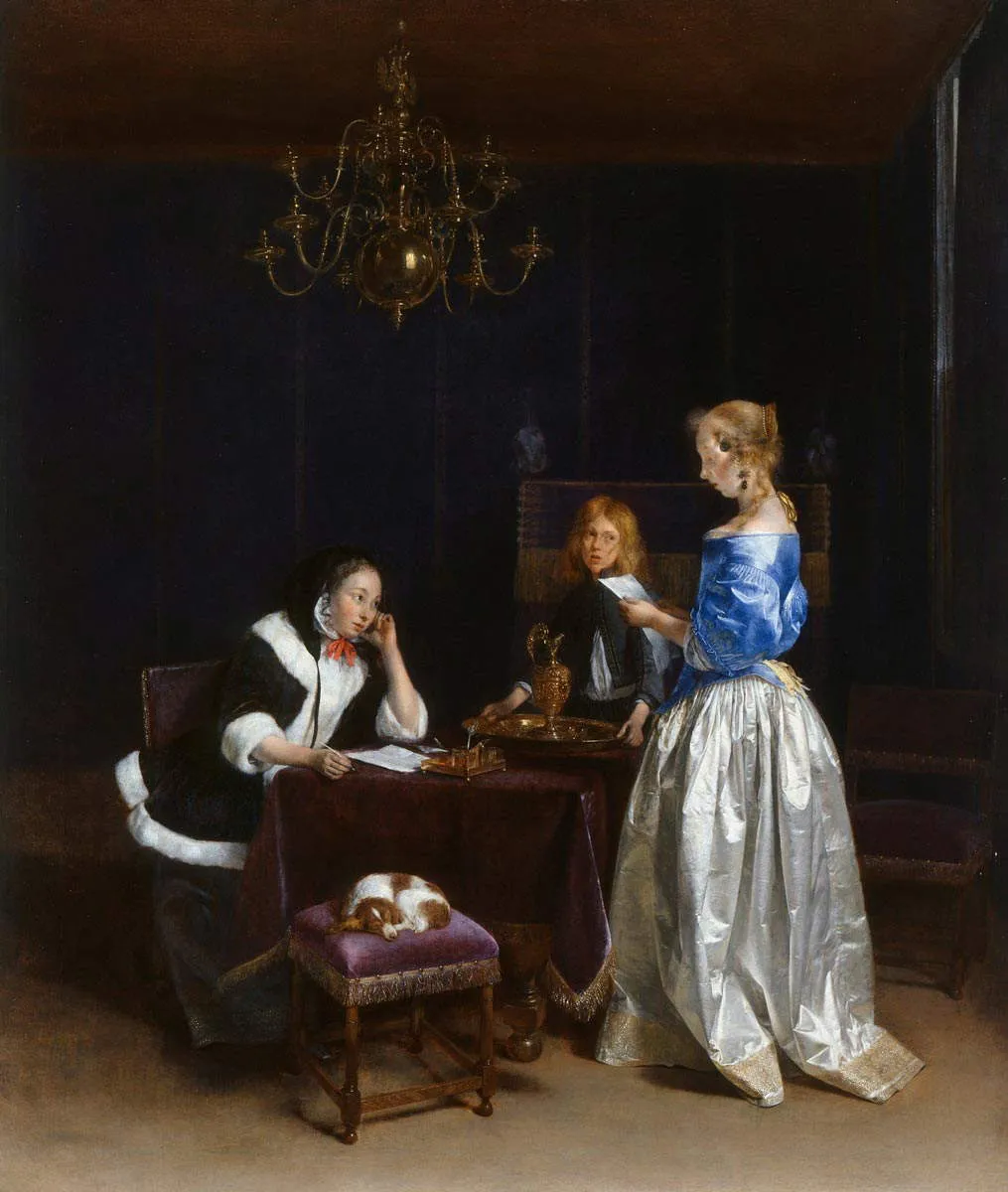 格拉特·特·博尔赫的《信》则展现了另一个居家场景,却是一个私密而亲切的时刻。画中三位人物占据了整个画面:一位女仆,一个男孩和一位手持信件的年轻女子。画面背景是上层阶级的房间,天花板上悬挂着一盏枝形吊灯。柔和、平静的光线主要照在手持信件的年轻女子身上,这种光线的处理方式如同神圣场景一般。女子专注的神情向观众传达了她全神贯注于信件内容。