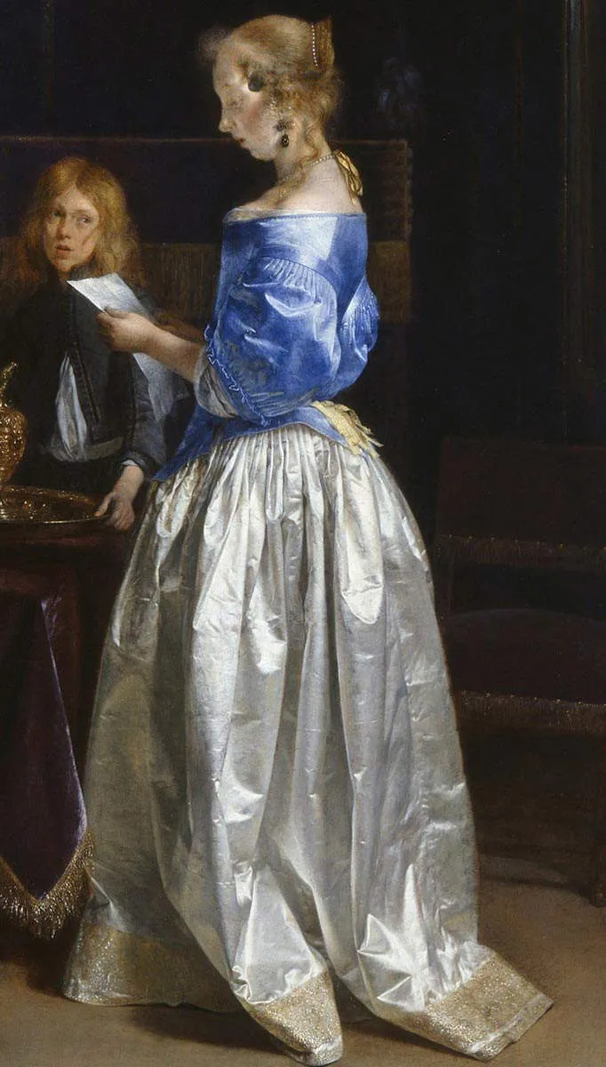 这位读信的年轻女子穿着华贵的衣衫:一件深蓝色衬衫搭配一条丝绸缎面长裙,裙摆垂落至地面。特·博尔赫以其精细的细节刻画和娴熟的笔触表现布料质感而闻名。