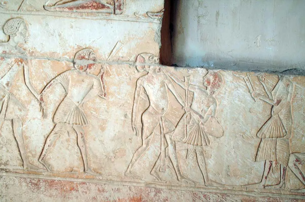 在新王国时期,埃及对努比亚和努比亚人的官方叙事采取了更加强硬的姿态。塞提一世(约公元前1294-1279年在位)和拉美西斯三世(公元前1184-1153年在位)的庙宇和陵墓经常将努比亚人描绘成埃及的军事敌人。特别是塞提的陵墓,以保存最完好的努比亚人、利比亚人和迦南人的图像而闻名。其他值得注意的新王国时期例子包括萨卡拉的霍勒姆赫布墓(约公元前1323-1295年在位),那里描绘了努比亚囚犯被殴打的情景。图坦卡蒙国王(约公元前1336-1327年在位)的木箱上描绘了数十名被法老杀死的努比亚人,这也强化了努比亚人是敌人的观念。然而,新王国时期的埃及-努比亚关系比这更复杂。