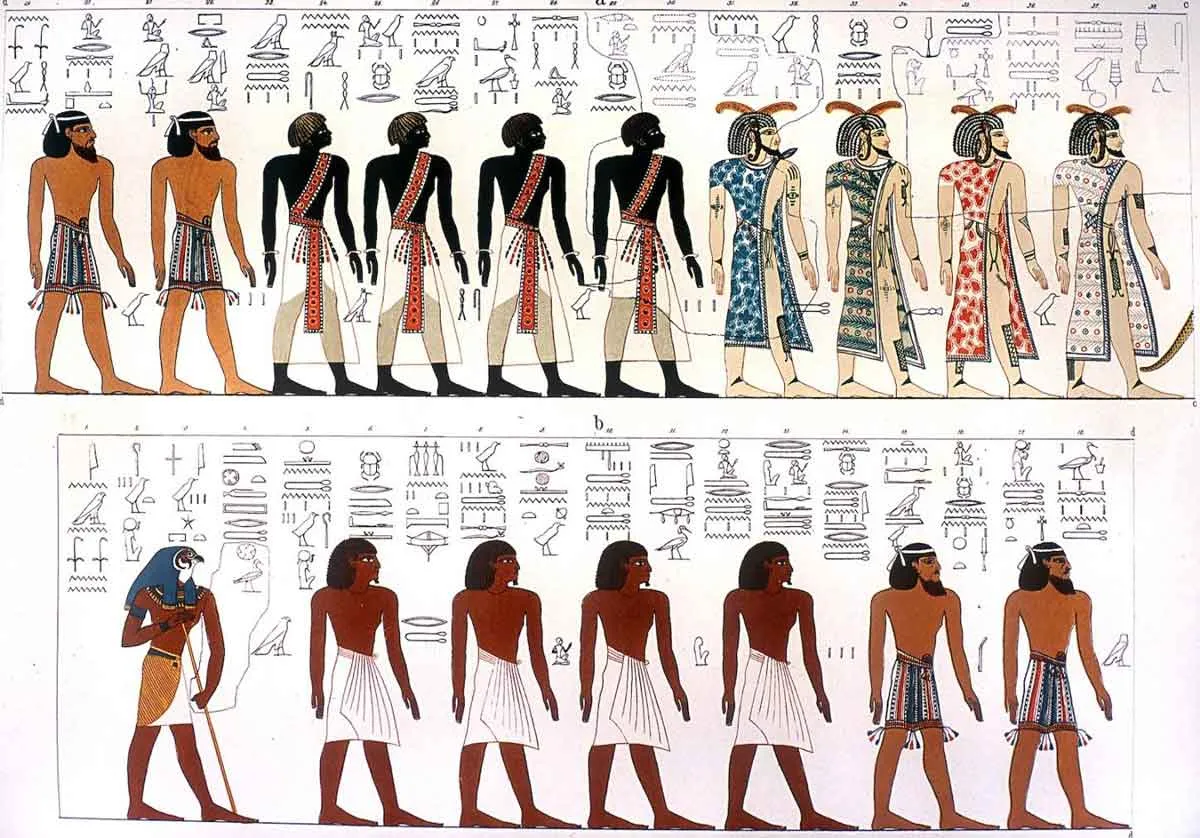 埃及人和努比亚人分别起源于不同的文化语言群体,拥有不同的种族和肤色特征。在艺术证据中,努比亚人常被描绘成身材高挑,肩宽体阔,皮肤黝黑,具有撒哈拉以南非洲的面部特征。另一方面,埃及男人通常被描绘得身材矮小,肤色呈红棕色,而埃及女人则被描绘成橄榄色肤色。尽管存在这些身体差异,但埃及人和努比亚人的历史却交织在一起。