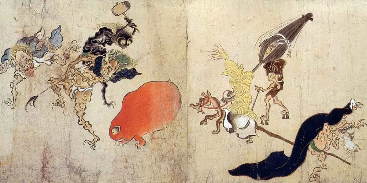 例如,在妖怪传说中,“付丧神”是指那些没有得到妥善照顾或被随意丢弃的旧日常用品,例如雨伞、灯笼或乐器。这些物品中的精神会变得复仇心切,物体就会长出手脚来吓唬曾经的主人。在《百鬼夜行絵巻》(百鬼夜行图卷)中,这些原本普通的物品,现在长出手脚,与其他妖怪一起在游行中行走。