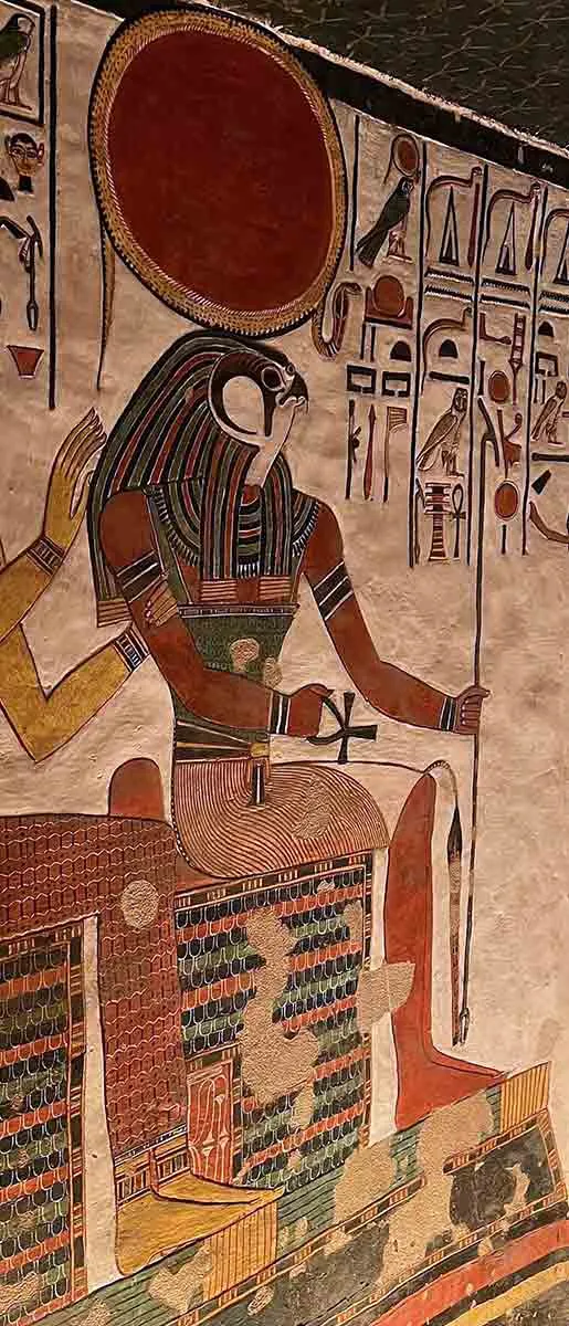在神话传说中,荷鲁斯是一位极其复杂的神,拥有许多不同的版本。其中有老荷鲁斯,他是大地之神盖布和天空之神努特五个孩子之一,因此是奥西里斯和赛特的兄弟。后来,荷鲁斯更为人知的是奥西里斯和伊西斯之子,赛特的侄子。最后,在希腊化和托勒密时期,他化身为哈波克拉底斯,一个希腊埃及混合体,被描绘成一个孩童之神。荷鲁斯也与拉合二为一,成为拥有太阳圆盘的鹰头神雷-霍拉赫蒂,太阳圆盘位于他头上方,周围环绕着一条眼镜蛇。
