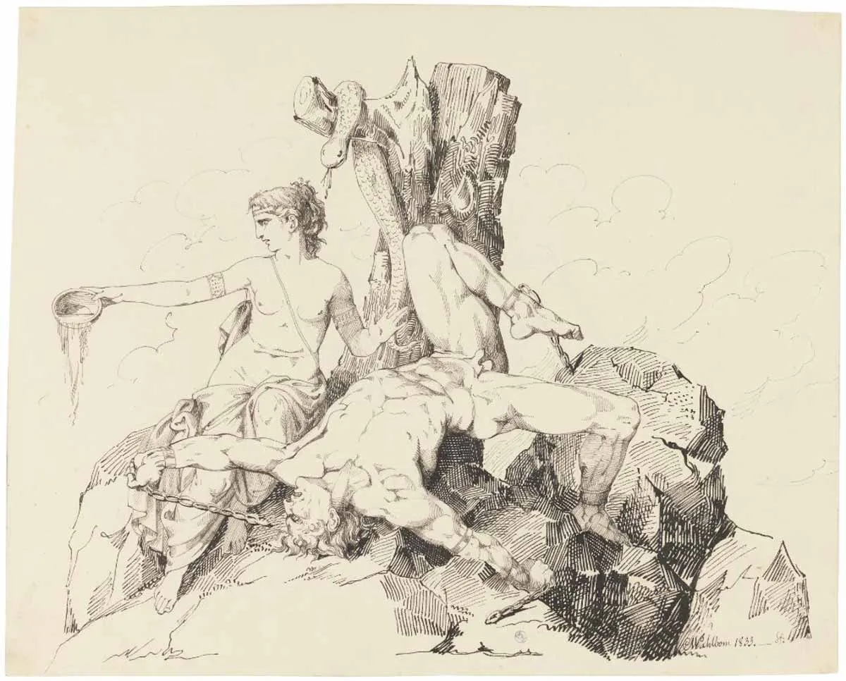 众神把洛基带到一个山洞里,连同他和他的艾希尔妻子西格恩所生的两个儿子。他们把他的一个儿子变成了狼。他失去了理智,撕碎了他的另一个兄弟,然后逃跑了。然后,众神用洛基另一个儿子的内脏将他绑在两块岩石上。他们找到了一条毒蛇,把它悬挂在洛基的头顶,让他痛苦地滴下毒液到他的皮肤上。