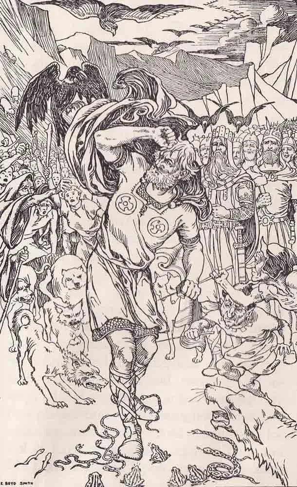 他们欺骗芬里尔,让他把自己绑在荒岛的一块岩石上。他们把蛇约尔蒙冈德扔进了米德加德周围的水域,并把赫尔放逐到地下世界。如果洛基杀死巴尔德尔的决定是对众神对待他的孩子的报复,那么众神自己也开启了最终导致诸神黄昏的事件链。