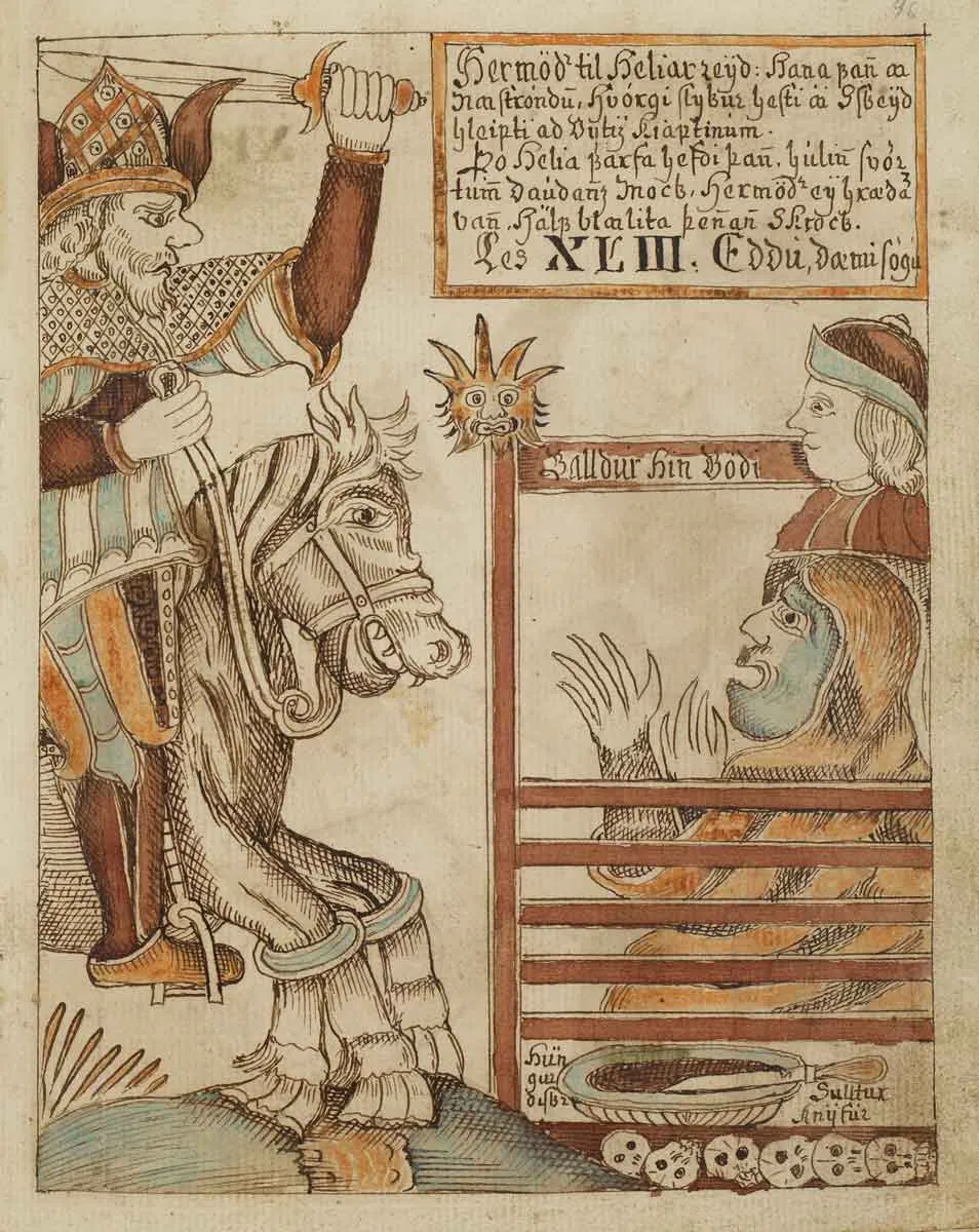 众神派赫密德,通常被认为是北欧的墨丘利,骑着奥丁的八条腿的战马斯莱普尼尔,前往赫尔海姆。他试图与赫尔谈判,让她释放巴尔德尔,解释说巴尔德尔是世界上最受爱戴的人,因此应该回到人间。