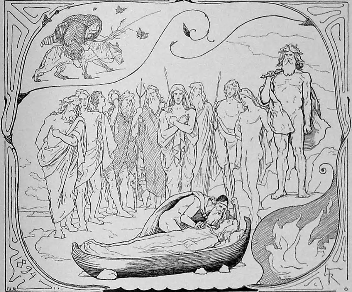 巴尔德尔的尸体在他的船赫林霍尼上被焚烧,悲伤的众神参加了葬礼队伍。他的妻子南娜要么是因悲伤而死,并与丈夫一起被烧死,要么是她跳进了丈夫的葬礼火堆。
