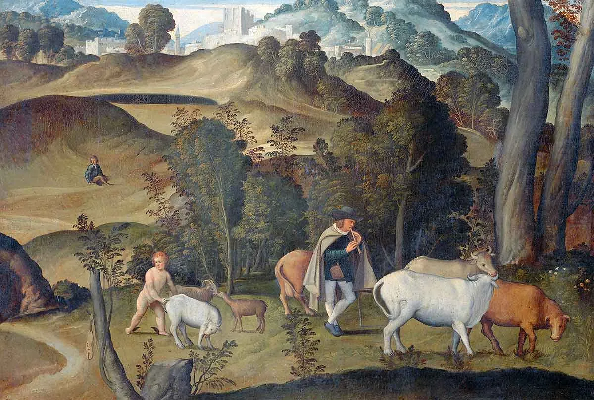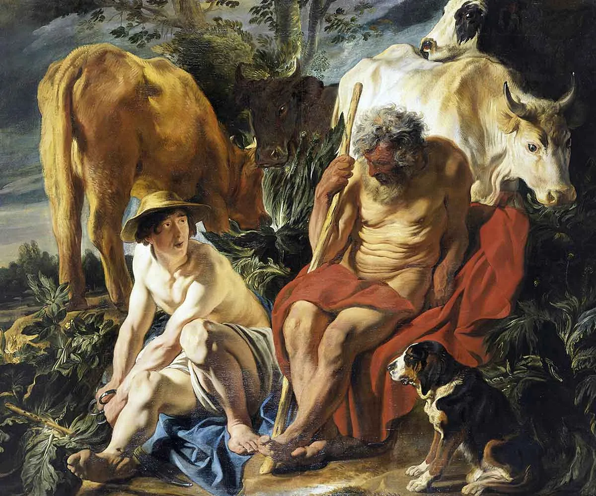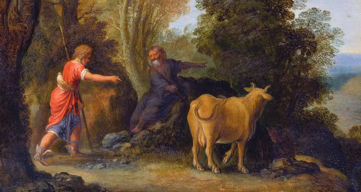 当赫耳墨斯的第二天太阳升起时,阿波罗从奥林匹斯山上下来查看他心爱的牛群。令他沮丧的是,大多数牛都消失了。阿波罗走到一位年长的男子那里,他正在照看他的葡萄园,并询问发生了什么事。这位年长的男子不顾赫耳墨斯的警告,讲述了一个他几乎不敢相信的场景:他前一天看到一个脚很奇怪的婴儿,他带了几头牛以之字形向后走。
