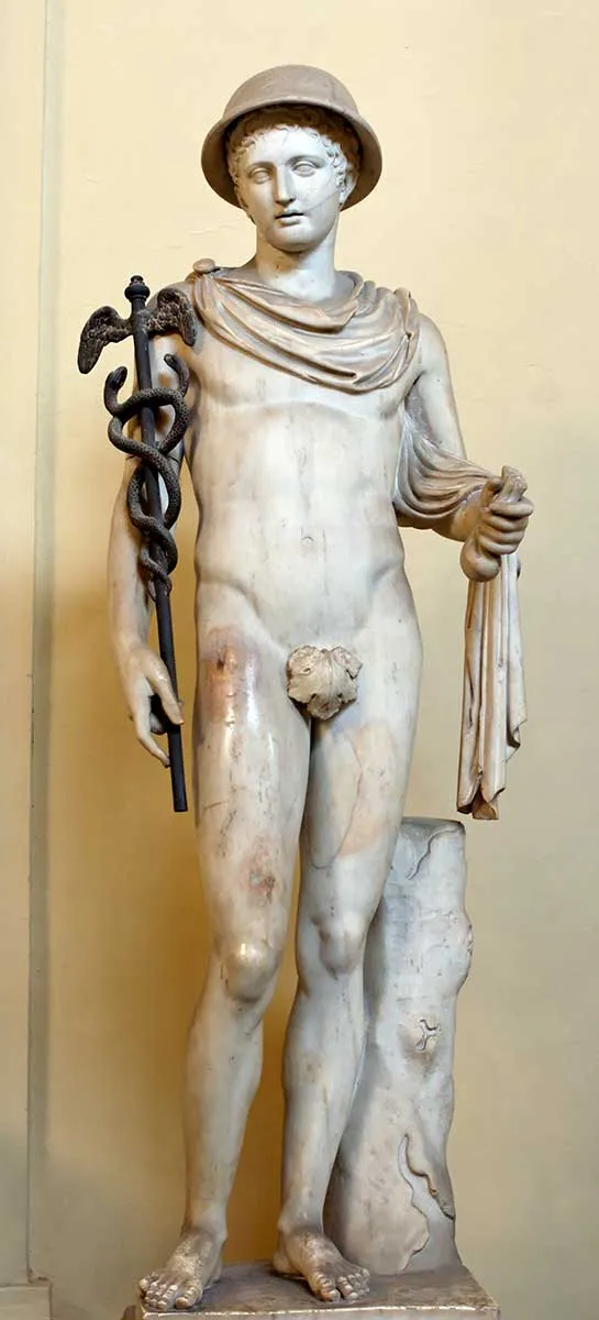 无论他的衣着如何,赫耳墨斯都容易被其标志性的权杖——kerykeion(卡杜塞乌斯)认出。这根权杖由纯金制成,长度约与人的手臂相仿,上面缠绕着两条相互交织的蛇,顶部形成一个圆圈,像角一样。在古希腊,kerykeion被使者用来象征他们的地位和权威。
