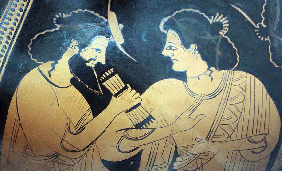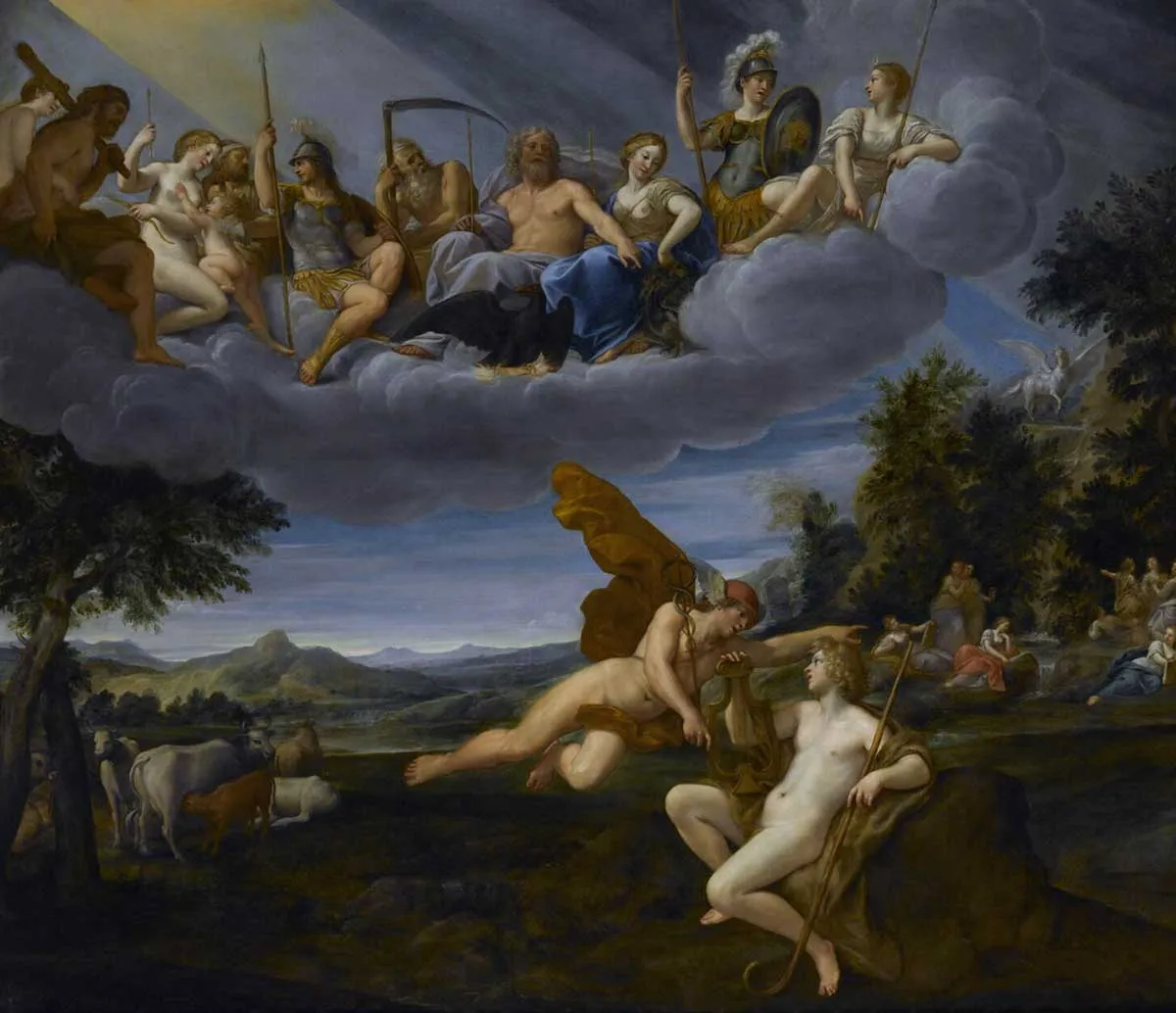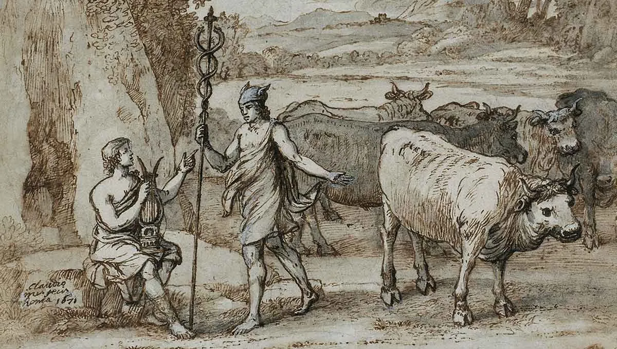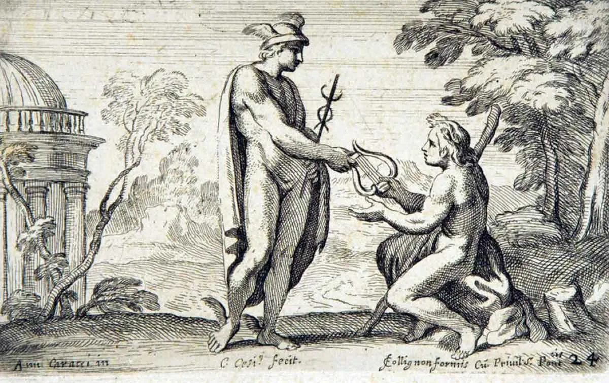 音乐之神阿波罗被赫耳墨斯演奏的乐器所迷住。阿波罗渴望了解这美妙的音乐,于是他与赫耳墨斯坐了下来,赫耳墨斯向阿波罗提供了一笔诱人的交易。
