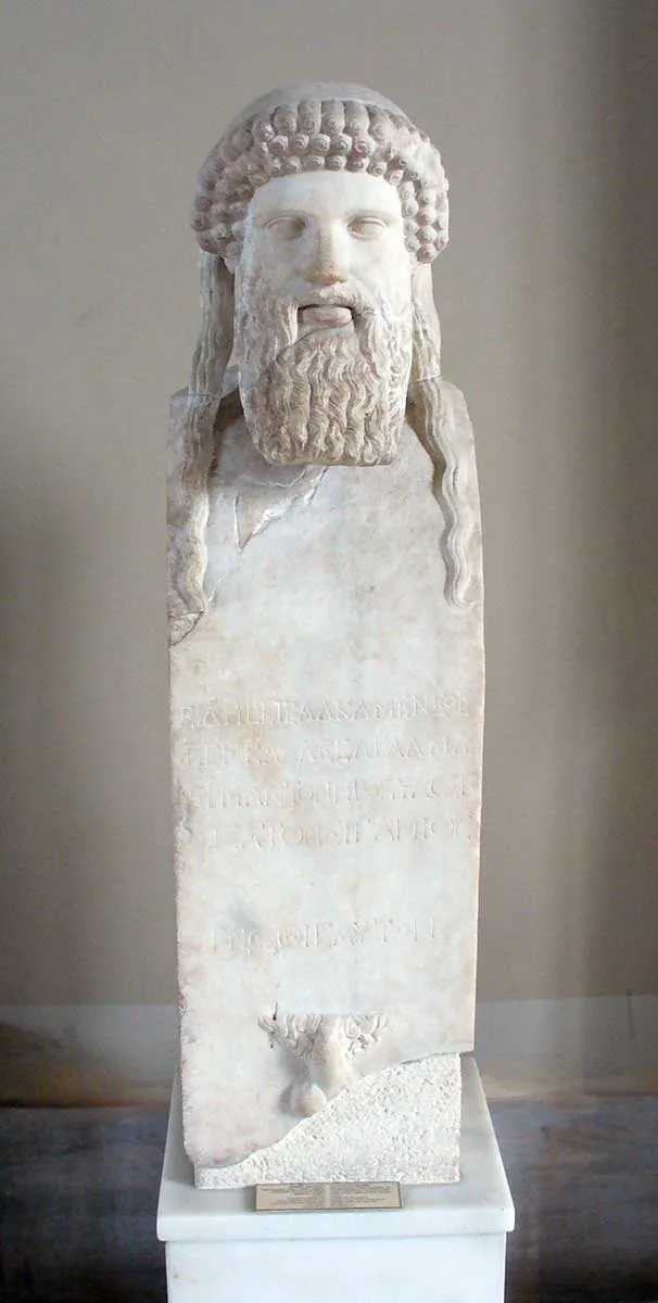 早期对赫耳墨斯的描绘与今天最常与他联系在一起的无须青年形象大相径庭。在这些早期的描绘中,赫耳墨斯经常被描绘成一位年长的男子,像一位乡村牧羊人。他通常戴着一顶宽檐软帽,留着胡须。这种年长的赫耳墨斯形象可以在赫耳墨斯像上找到,学者们认为这些雕像与这位神祗最早的起源有关。