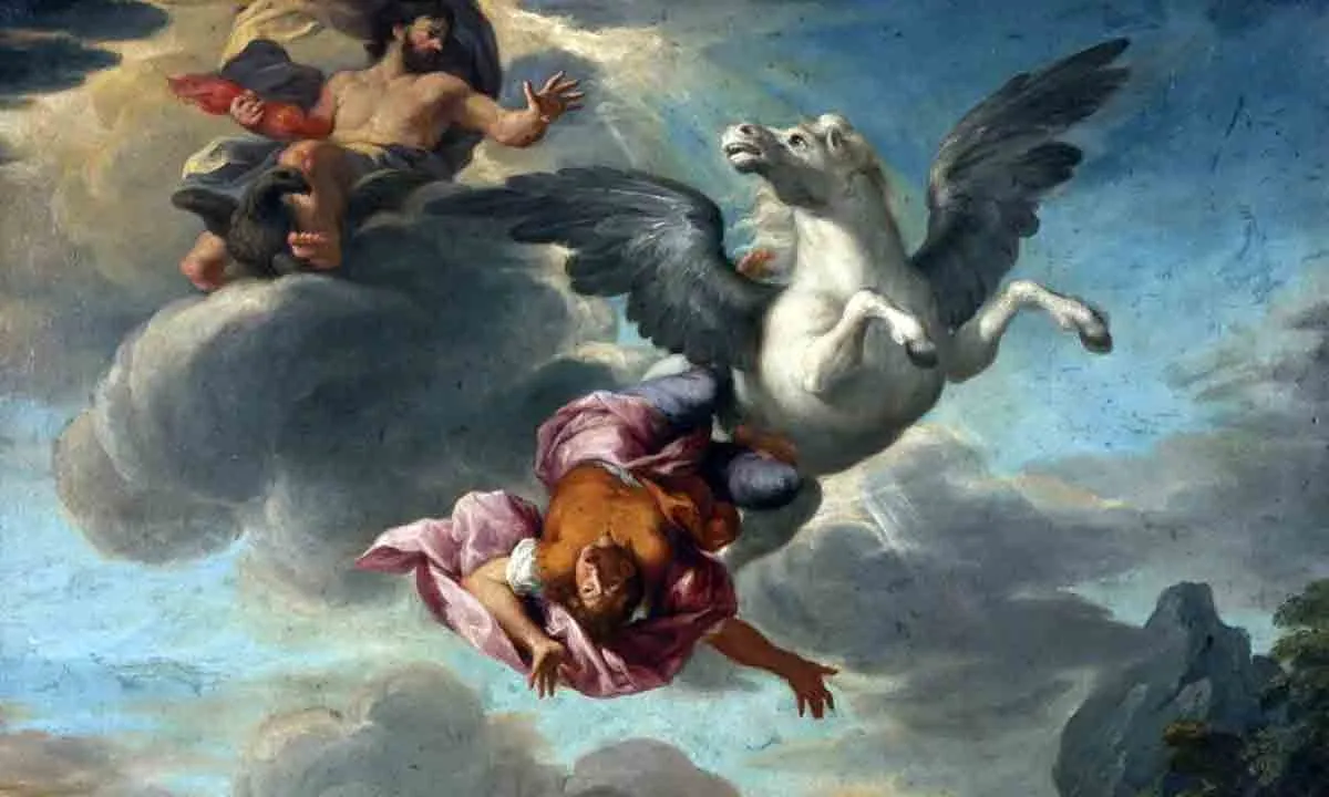 向他的家人和王国告别后,贝勒洛丰骑上了珀伽索斯,他最好的朋友和忠诚的伙伴,开始飞往奥林匹斯山。然而,宙斯无法容忍贝勒洛丰的傲慢;没有凡人可以冒充加入奥林匹斯山的众神,无论他们取得了怎样的成就。当珀伽索斯升上天堂时,宙斯派了一只牛虻去叮珀伽索斯,导致它猛然一跃,将贝勒洛丰从它的背上摔了下来。