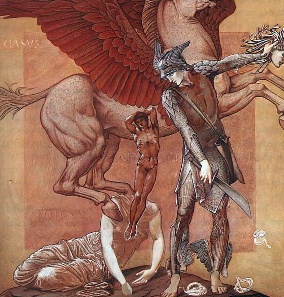 多年后,英雄珀尔修斯受命杀死美杜莎,并将她的头颅交给残暴的波吕德克忒斯国王。在奥林匹斯众神的帮助下,珀尔修斯戴着哈迪斯的隐身帽悄悄接近美杜莎。他用雅典娜送给他的镜子盾牌攻击她,避免和她直接对视,从而用他的亚当金刚石剑砍下了她的头。然后,意想不到的事情发生了:发育完全的双胞胎兄弟,长着翅膀的白马珀伽索斯和巨人克律萨俄耳,从美杜莎的脖颈处喷涌而出。