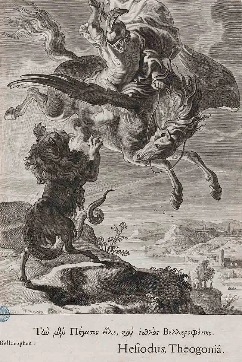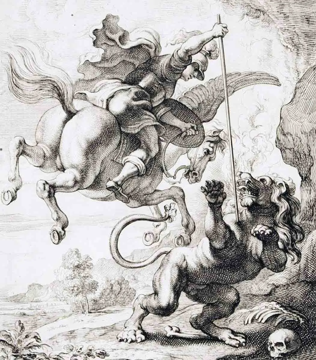 在珀伽索斯的帮助下,贝勒洛丰成为了一位传奇英雄。他们翱翔于天际,击败了可怕的喷火怪奇美拉。这只可怕的生物长着狮子的头部和前腿、山羊的躯干和后腿以及蛇的尾巴。一个喷火的羊头从躯干上伸出来,尾巴末端有一个蛇头。