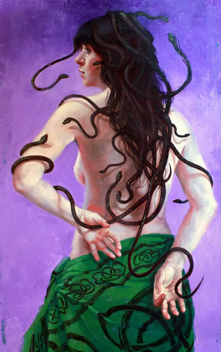 无论是否自愿,在处女神雅典娜的神殿中发生性行为都是不可饶恕的亵渎行为,必须受到惩罚。作为同为奥林匹斯众神的一员,雅典娜无法惩罚波塞冬在她的神殿里强迫一个凡人女子。她没有承认美杜莎是性侵的受害者,而是将所有的怒火都转向了她。雅典娜将美杜莎变成了可怕的戈尔贡,诅咒她拥有令人石化的凝视和蛇发,注定要被男人追杀。