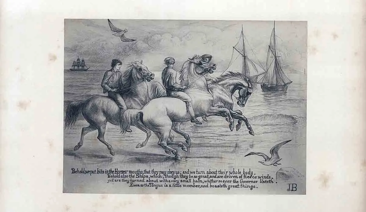 “看哪,船虽然很大,又被猛风吹着,却用很小的舵,随掌舵者的意思转动。 舌头也是这样,虽然是个小小的肢体,却夸大其词。看哪,一点儿火能点着多大的树林!舌头也是火,在我们百体中,是个不义的世界,能污秽全身,也能点着生命的轮子,它自己也被地狱所点着。”