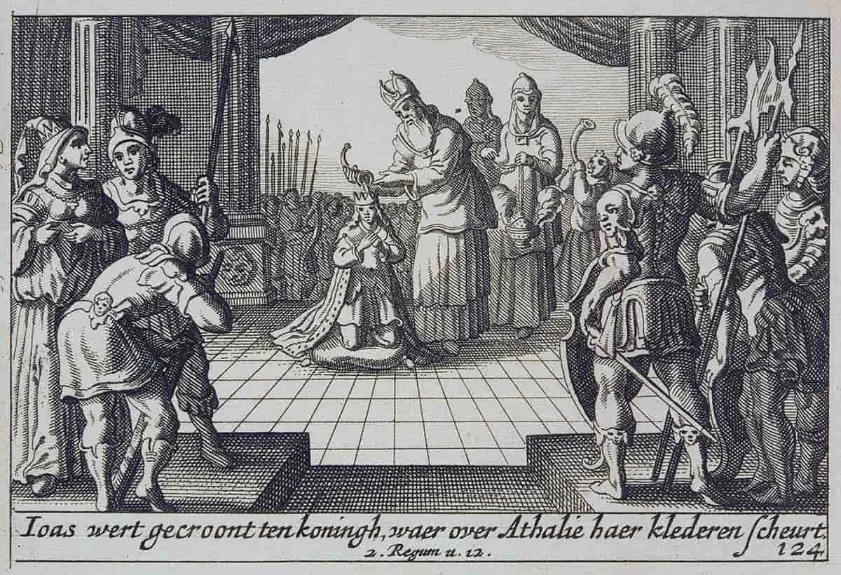 当犹大王亚哈谢的儿子约阿施还是个婴儿时,他的祖母亚他利雅,一位来自北方的公主,下令杀害犹大王室的所有成员。约阿施被一位名叫耶何耶沙的亲戚从屠杀中救了下来,因此成为大卫世系中唯一幸存的男性。