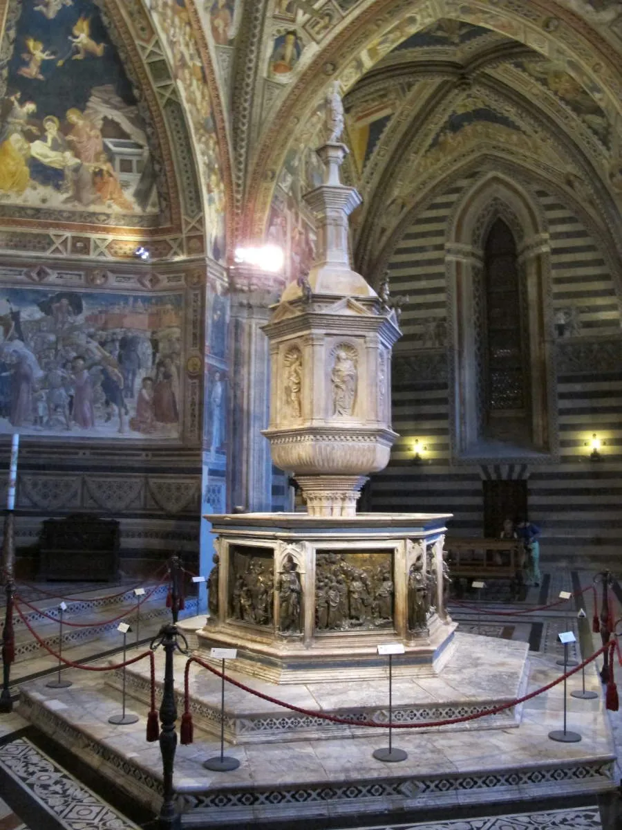 几个世纪以来,大多数著名的意大利艺术家都为大教堂工作过。尼古拉·皮萨诺在 1265 年至 1268 年之间雕刻了讲坛。多纳泰罗的圣约翰洗礼者青铜雕像装饰着同名的小教堂,而米开朗基罗则为皮科洛米尼祭坛创作了圣彼得、圣保罗、圣皮乌斯和圣奥古斯丁的雕像。杜乔·迪·布奥宁塞格纳负责设计祭坛后面的彩色玻璃窗,而吉安·洛伦佐·贝尼尼则创作了圆顶顶部的灯笼。