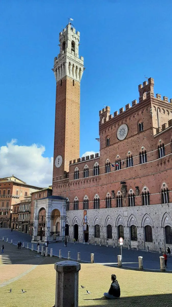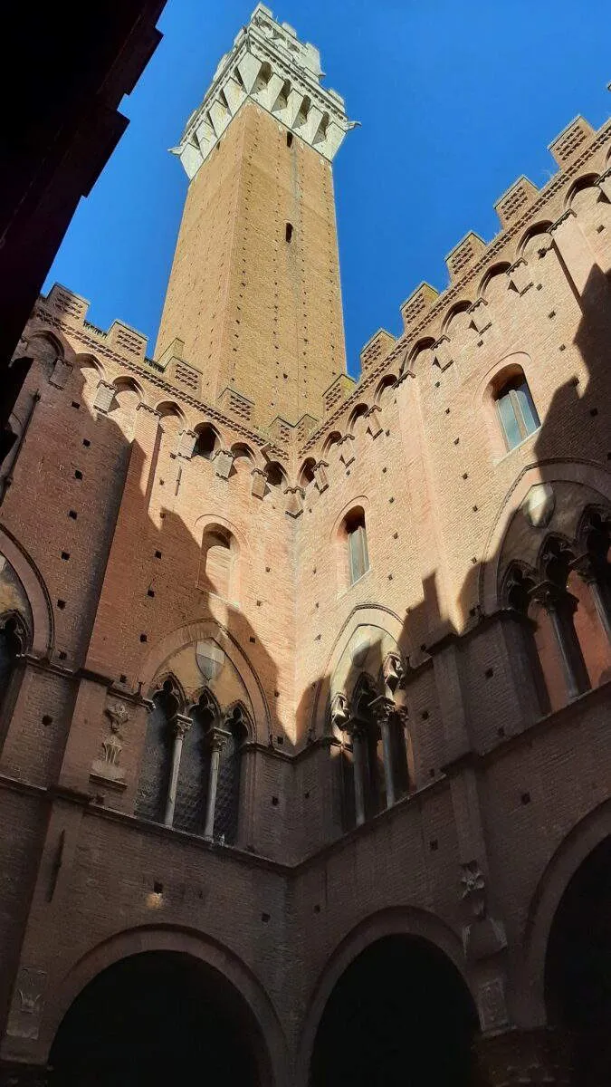 公共宫殿(市政厅)最初建于 1297 年至 1310 年之间,是市长和九人委员会的所在地。这座建筑融合了意大利中世纪和哥特式建筑元素,也是锡耶纳公民权力的象征。这座新的市政建筑的建造是九位统治者和锡耶纳公社和人民的守护者(通称九人委员会)下令建造的,该委员会是统治锡耶纳 60 年的共和国政权,开启了这座曾经饱受内部分歧困扰的城市政治稳定和繁荣的时期。