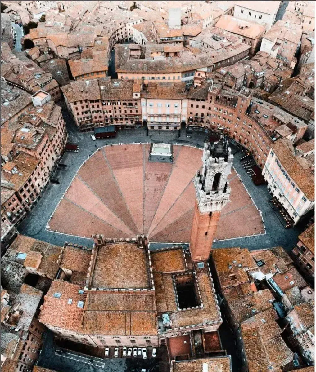 大约在同一时期,当地政府决定将这两个区域合并成一个开放空间。在 1262 年至 1297 年之间,锡耶纳当局还颁布了一系列法令,使面向广场的建筑立面更加统一。特别是,这些措施规定,这些建筑必须包含双拱或三拱窗户。