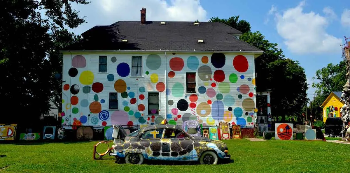 底特律在 20 世纪 60 年代的种族紧张局势及其工业衰退中遭受了巨大损失。许多房屋、工厂和建筑被废弃了几十年。然而,这座城市正在复兴,艺术家们正在带头将被遗忘的空间变成艺术和表达的中心。海德堡项目就是最好的例子之一。当地艺术家泰瑞·盖顿于 1986 年启动了该项目,以改造他被遗弃的街区。他和当地其他艺术家以及孩子们一起,将这一空间变成了一个充满活力的社区艺术中心。